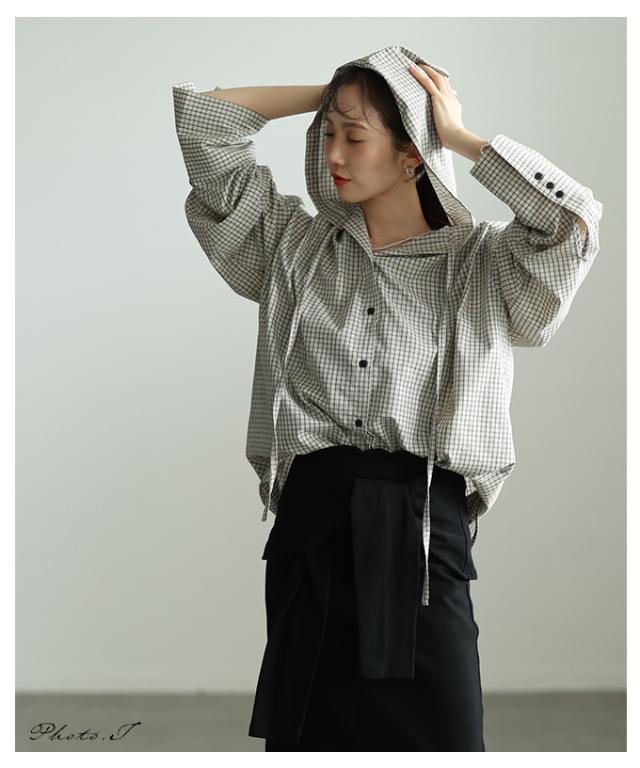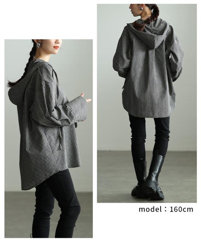 特徴: チェック フード ロングカフス テールヘム スピンドルコード ボタン