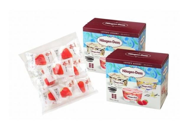 甘酸っぱい苺の中に練乳入りアイスを詰め込んだ苺アイスとハーゲンダッツで人気のフレーバー3種類が入った”ラバーズアソート”をセットにしてお届けいたします。