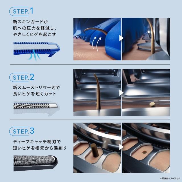 独立して浮き沈みする3つの刃で、肌の凹凸にもしっかり密着。深剃りを実現します。