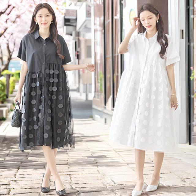 立体的なドットモチーフが目を引く、個性的なデザインシャツワンピース。 ベースはシンプルなシャツタイプで、きちんと感とデザイン性を兼ね備えたバランスの良い仕上がりです。 スカート部分に重ねたチュール素材が軽やかな透け感を生み、スタイリングに立体感をプラス。 ゆったりとしたシルエットで着心地も良く、一枚で華やかなスタイルが完成するアイテムです。 |