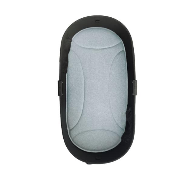 [2]マットの先端に付いたギャザーに底板をはめ、コット内に戻します。