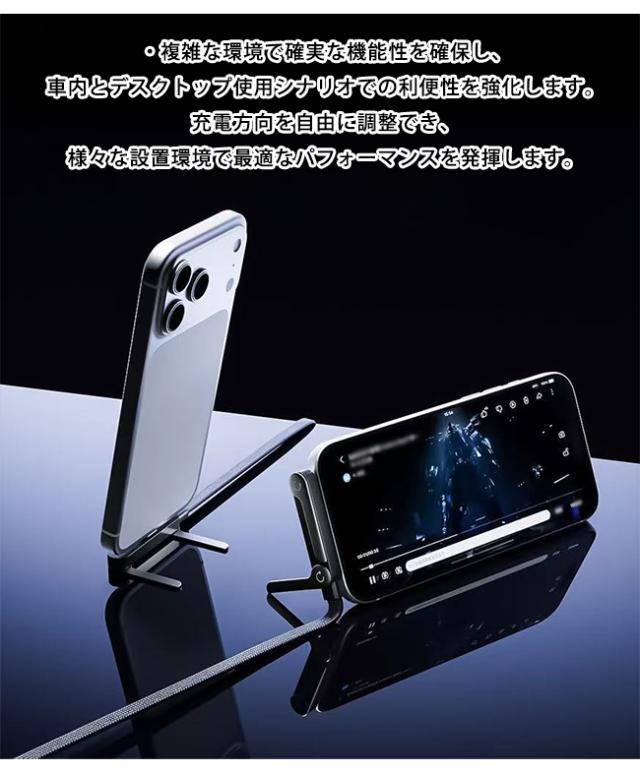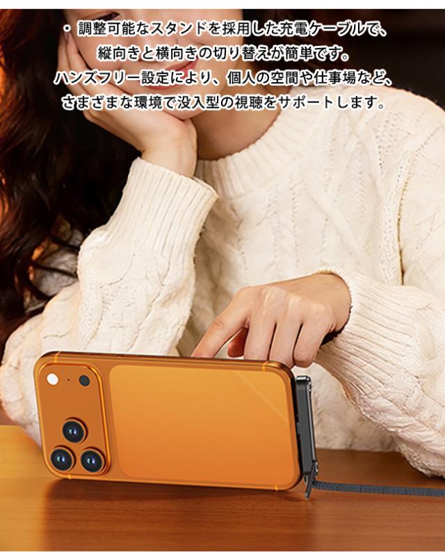 ・ 調整可能なスタンドを採用した充電ケーブルで、縦向きと横向きの切り替えが簡単です。ハンズフリー設定により、個人の空間や仕事場など、さまざまな環境で没入型の視聴をサポートします。