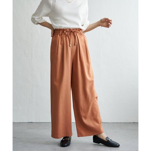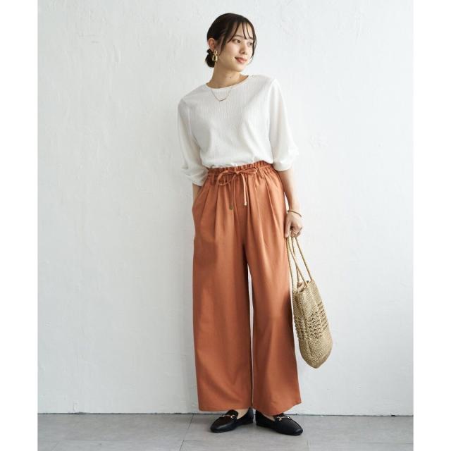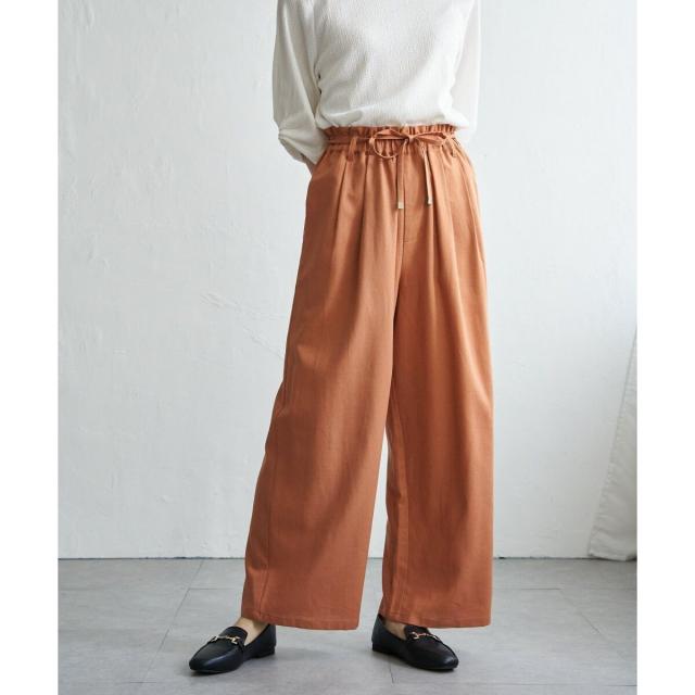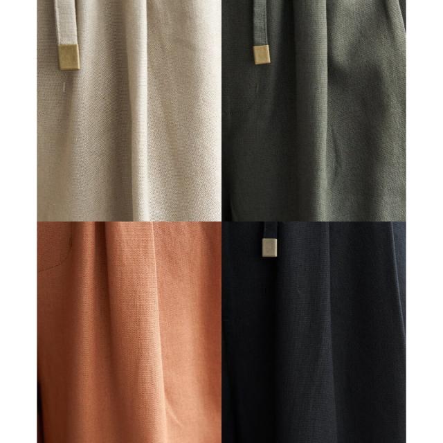 ウエストはゴム仕様でリラックスしたはき心地ながら、共布ベルトの先端にあしらったゴールドカラーのパーツが上品な印象を添えます。