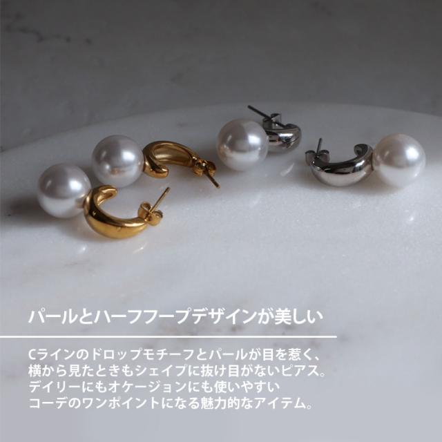 Cラインのドロップモチーフとパールが目を惹く、横から見た時もシェイプに抜け目がないピアス。