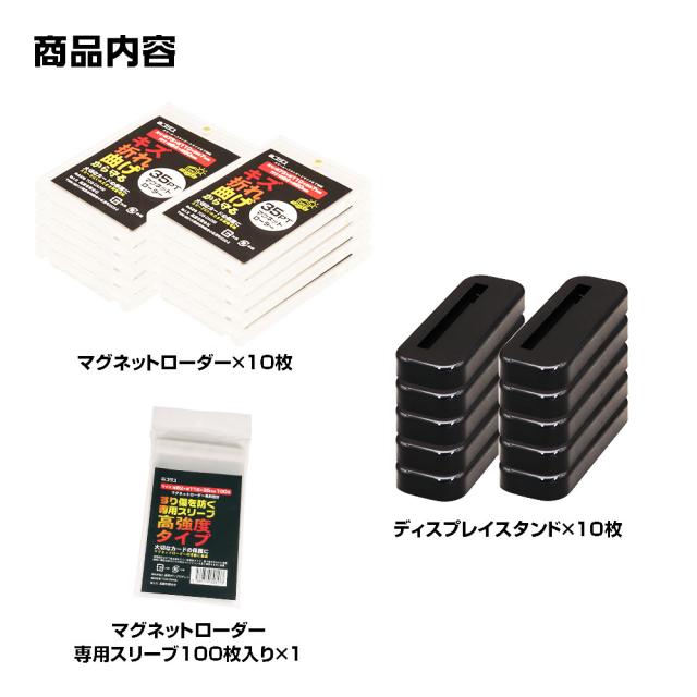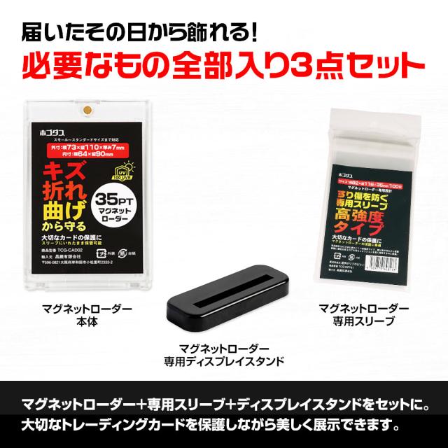 届いたその日から飾れる!必要なもの全部入り3点セット。マグネットローダー+専用スリーブ+ディスプレイスタンドで大切なトレーディングカードを保護しながら美しく展示できます。