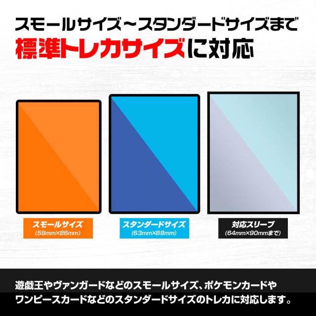 遊戯王やヴァンガードなどのスモールサイズ。ポケモンカード、ワンピースカード、MTG、デュエルマスターズなどのスタンダードサイズのトレカに対応します。