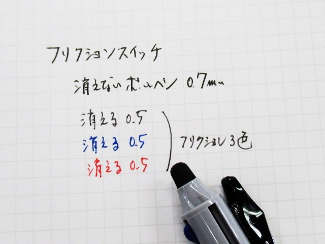 中央の黒グリップの時は消えない油性ボールペンが出ます。他の3色レバーは消せるフリクションインクです。色が見た目ではっきりわかるので間違えません。