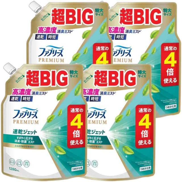 ファブリーズ 消臭スプレー 布用 PREMIUM 速乾ジェット 消臭・除菌スプレー ふんわりおひさまの香り 詰め替え 4倍/1280mL×4袋 [ケース品]