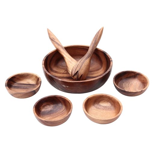 不二貿易 アカシア 木製食器 7点セット ラウンドタイプ 【大皿×1 小皿×4 取り分け用スプーン×1 取り分け用フォーク×1】 割れにくい 軽量 天然木 ギフト 15971