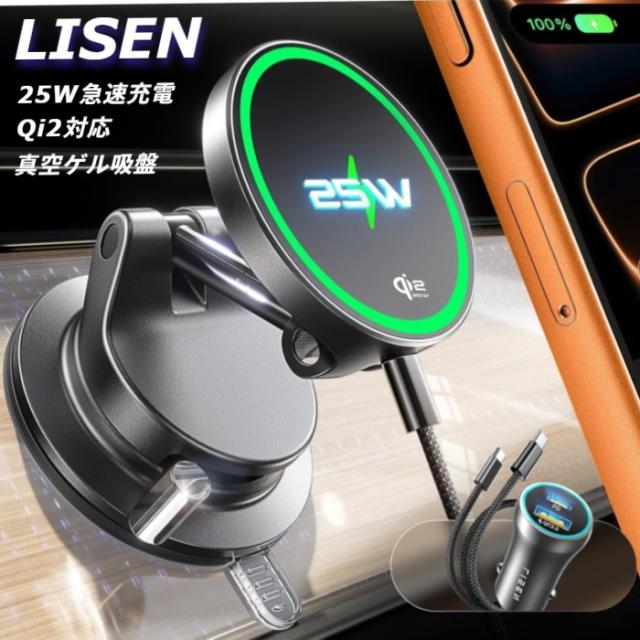ワイヤレス 充電ホルダー LISEN qi2.2 25W急速充電 真空吸盤 レバー調整ロック シガーソケット付属 iPhone17-12シリーズ対応( iOS 26バージョン以降25 w対応) 新入荷 【 真空吸着式 スマホホルダー 車 ワイヤレス充電 24個のN55磁石 】
