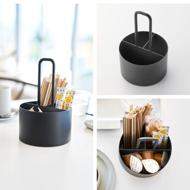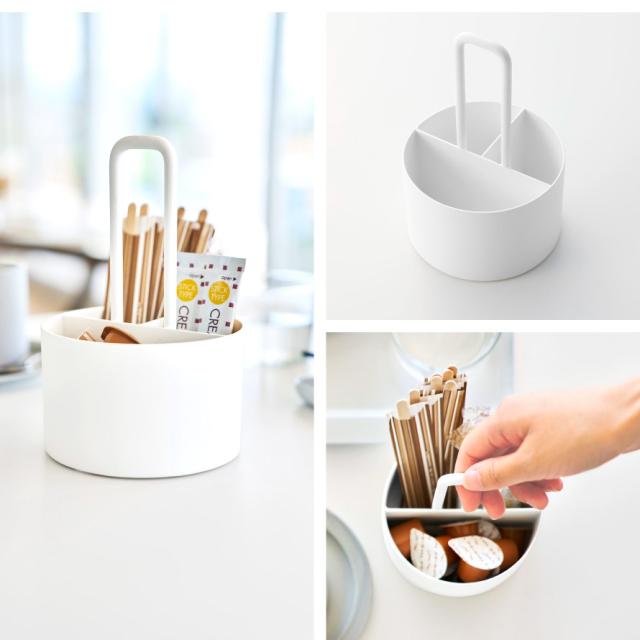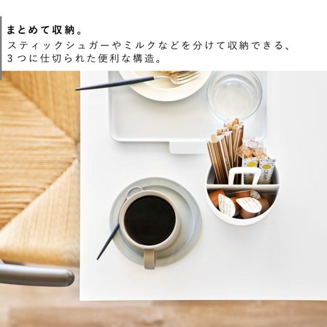 ティータイムに必要なアイテムをまとめてすっきり収納できる、ハンドル付き収納ケース。スティックシュガーやミルク、マドラーなどを分けて収納できる、3つに仕切られた便利な構造。種類ごとに整理できるため、使いたい時にすぐ取り出せます。ご自宅用はもちろん、来客時にも重宝します。