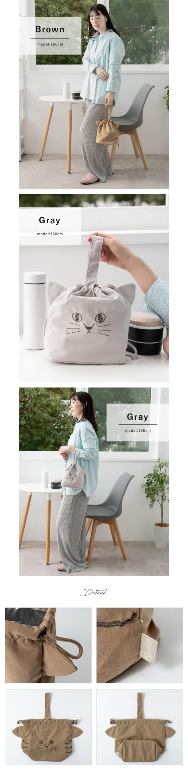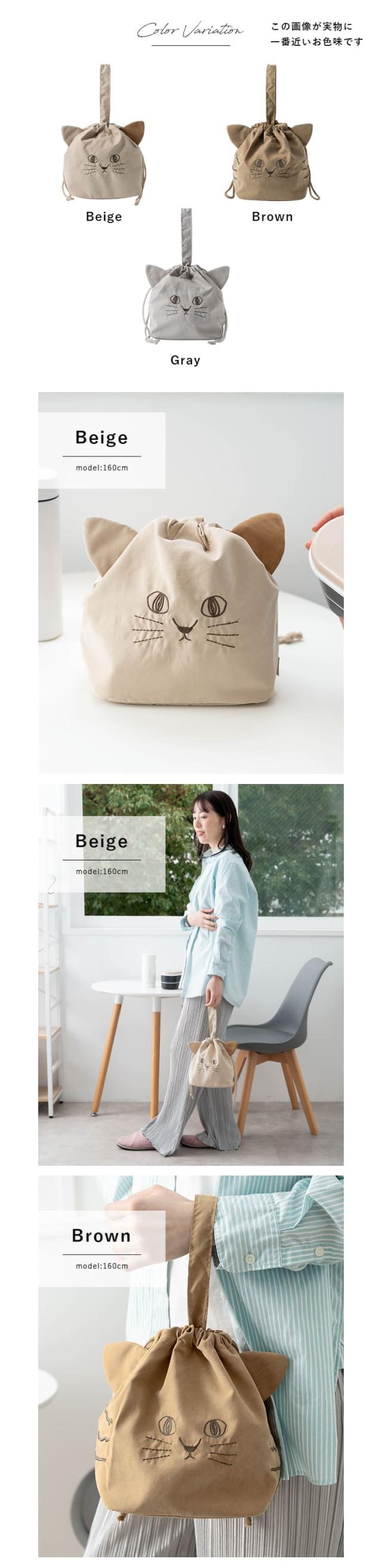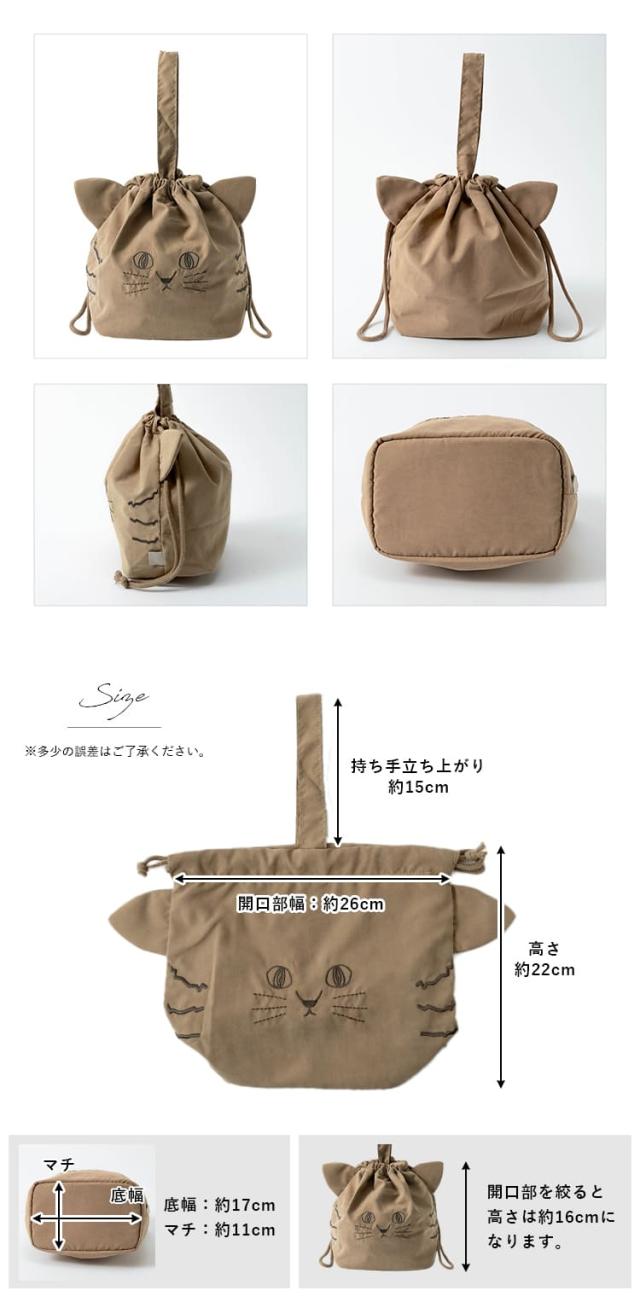 巾着をキュッと絞ると猫の顔の形に!
