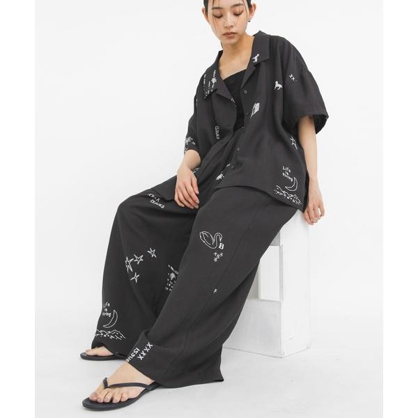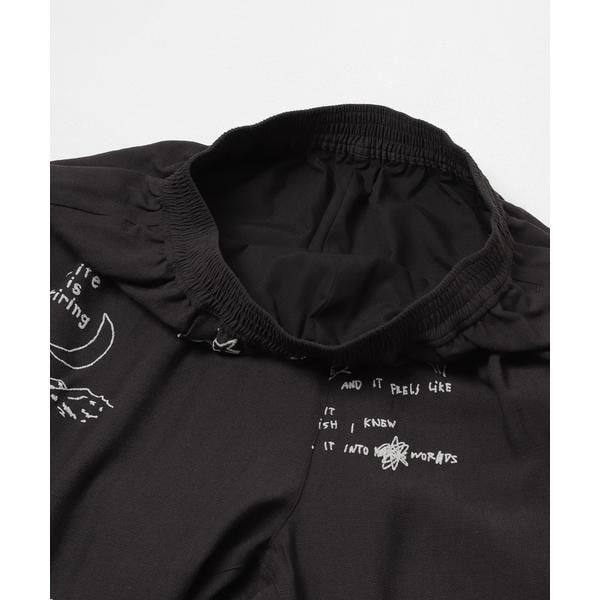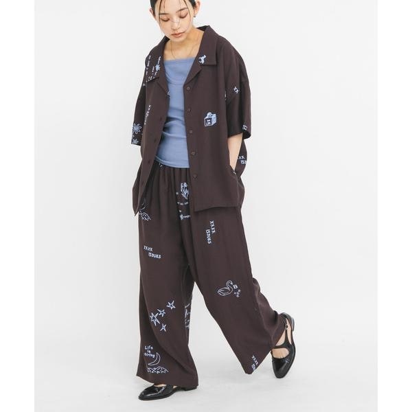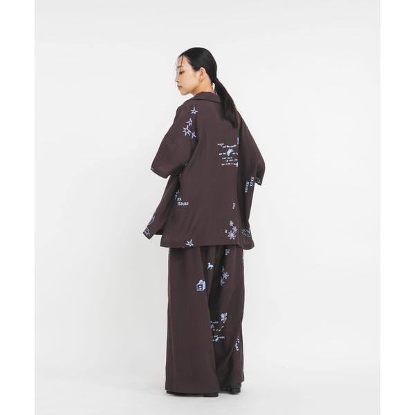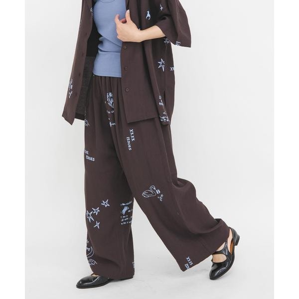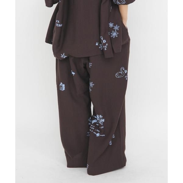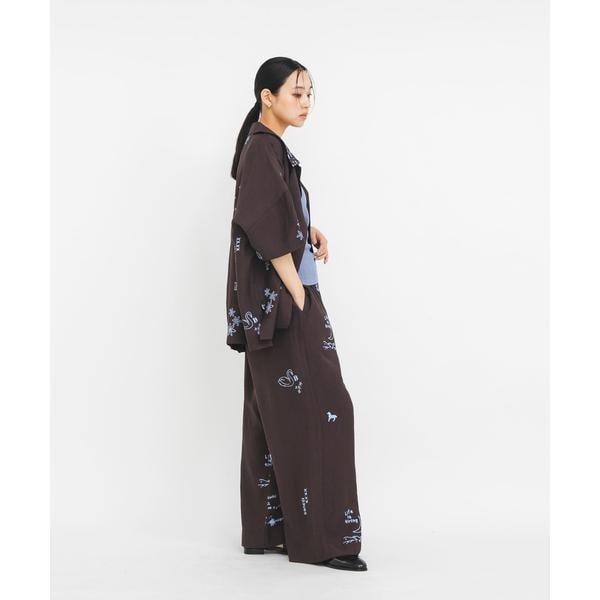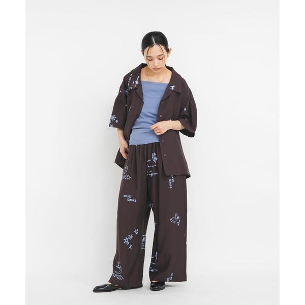 ワイドでリラクシーなパンツに、キャッチー且つインパクトのある刺繍プリントを全面に施した1本。プリントですが刺繍に見えるデザインを採用しており、夏にぴったりな落ち感のあるさらっとした素材や楽に穿けるウエストゴム仕様もポイントです。同素材のTATTOOオーバーシャツ(KB26230−2035290)とセットアップの着こなしもおすすめです。