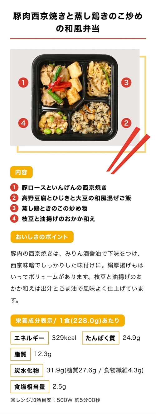 | 商品内容 | ●豚肉西京焼きと蒸し鶏きのこ炒めの和風弁当 1食 |