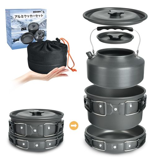 SOHAPI アルミクッカーセット キャンプ用品 鍋 アウトドアケトル クッカー くっかーセット アウトドア 調理器具 フライパン キャンピング鍋 収納袋付き 2?3人に適応 折畳み式 軽量 コンパ…