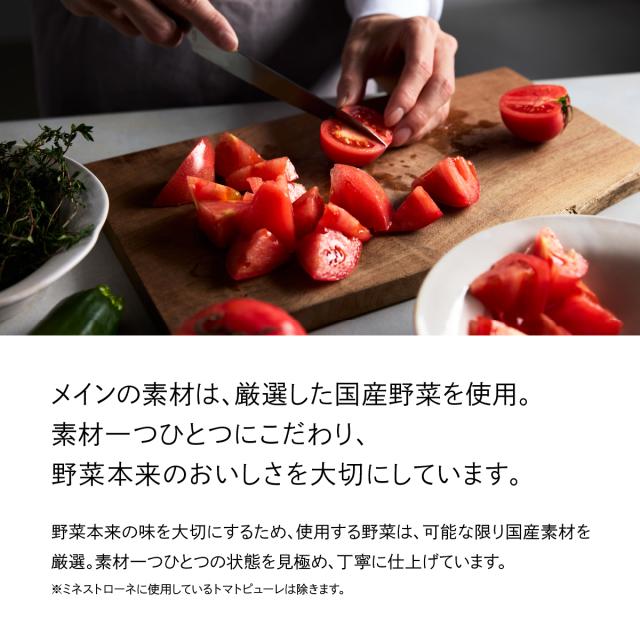 ごろごろ野菜の食べるミネストローネ×2、焼きとうもろこしの香ばしポタージュ×2、飴色玉ねぎと焦がしバターの濃厚スープ×2、4種きのこのなめらかポタージュ×2、にんじんをまるごと味わうポタージュ×2