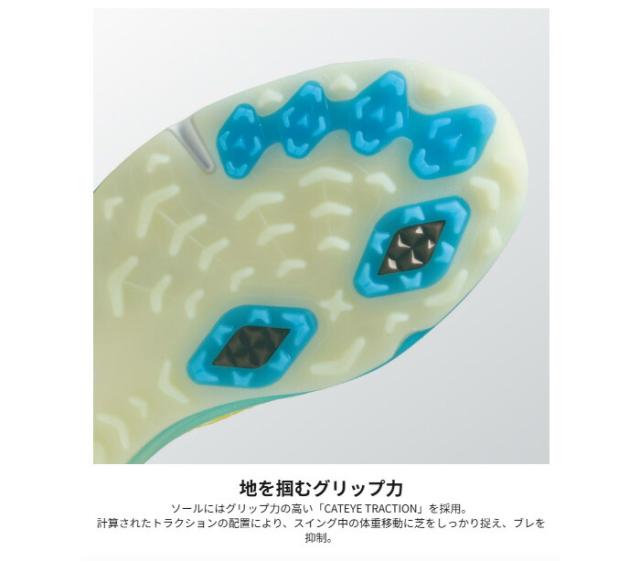 立体構造のアッパーは人体工学に基づいて成形され、アシンメトリー構造がフィット感をより高めてくれるため、スイング時の安定性がさらに向上。補強アッパーと安定プレートの相乗効果により、横ブレを抑え、力の伝達をしっかりサポートします。