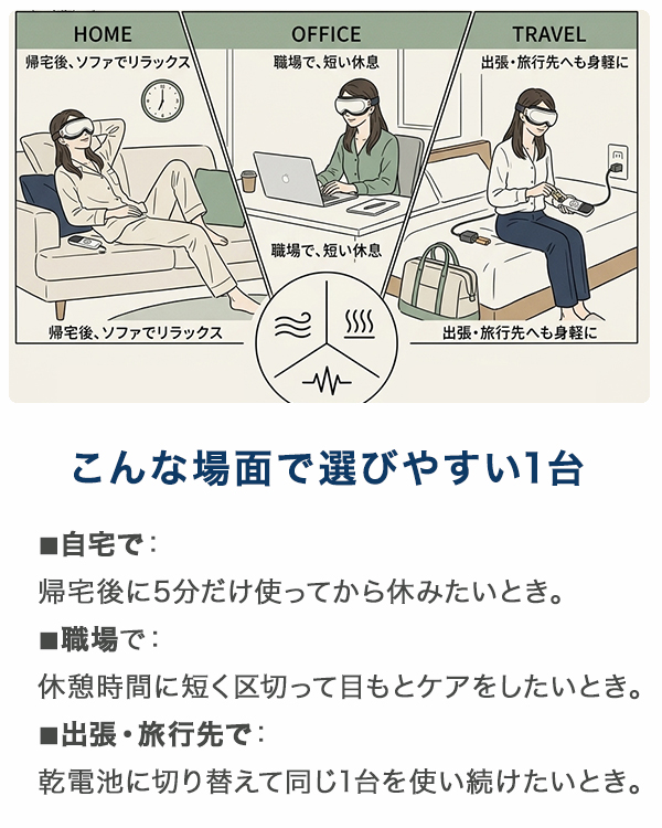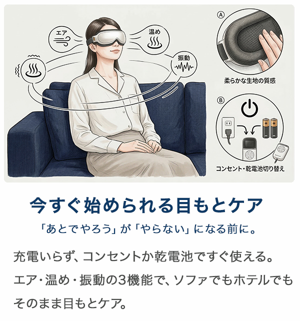 充電いらず、コンセントか乾電池ですぐ使える。エア・温め・振動の3機能で、ソファでもホテルでもそのまま目もとケア。