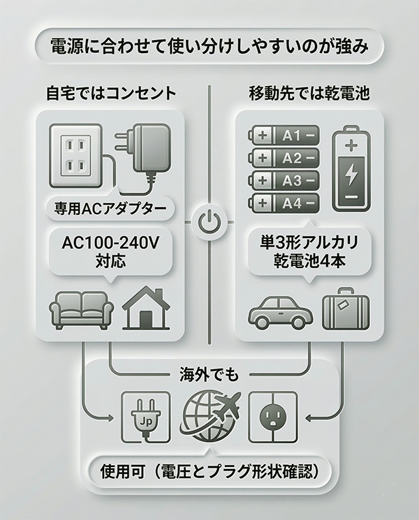 自宅ではコンセント、移動先では乾電池と、場所に合わせて電源を選べる仕様です。