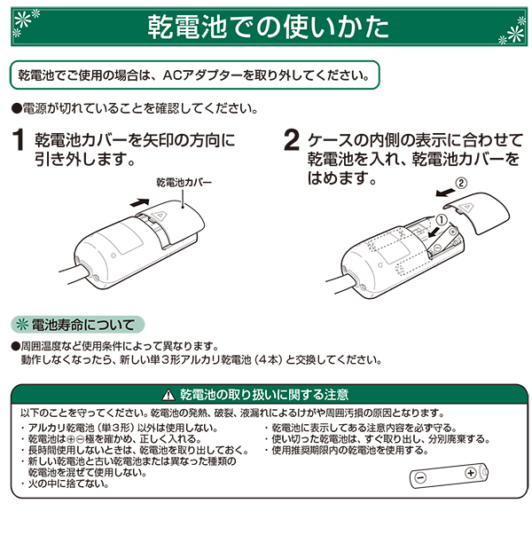 ・乾電池は単3形アルカリ乾電池以外使用不可。新旧・異種混用禁止。