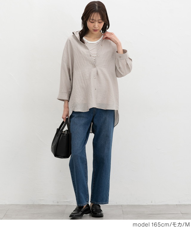 ゆったりした幅とヒップまですっぽり隠れる丈感で体型もカバー。
