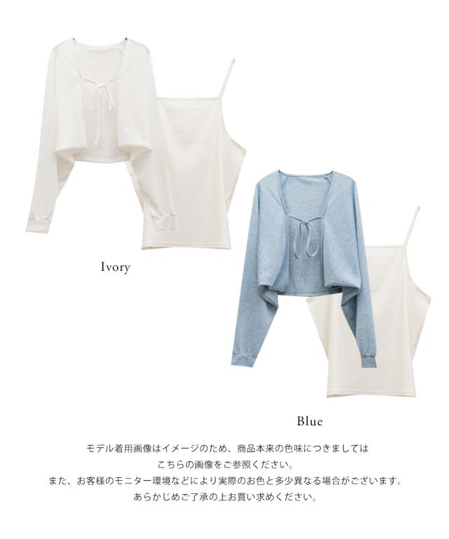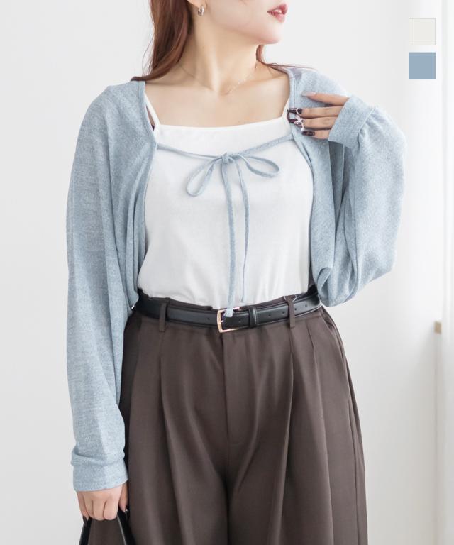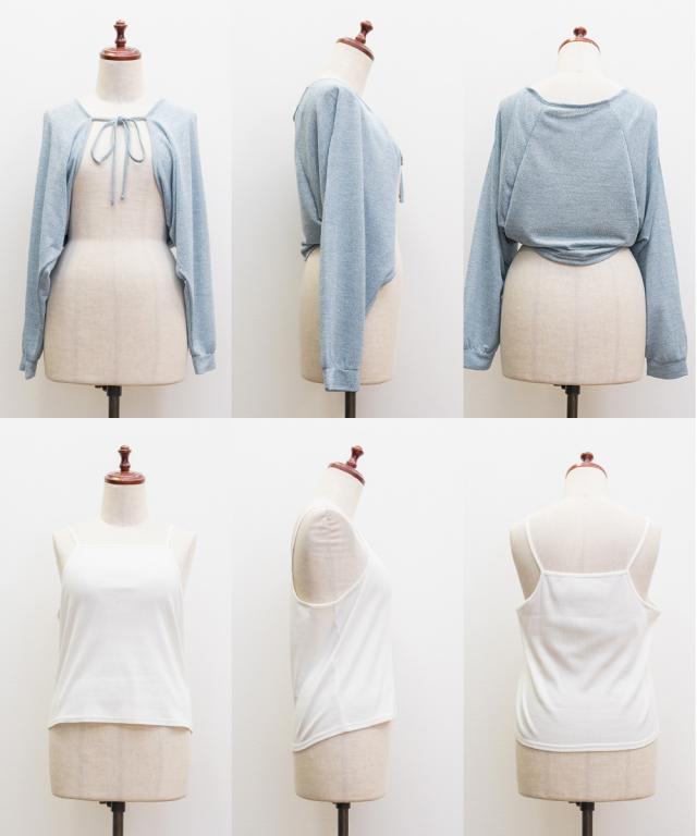 | ボレロ:やや伸縮性のある薄手のシアー素材です。 キャミソール:程良く伸縮性のある柔らかなリブ仕様のカットソー素材です。 |