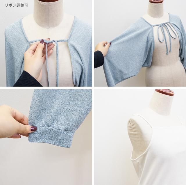 ボレロ:裏地無し、透け感有り、伸縮性少し有り / キャミソール:裏地無し、透け感わずかに有り、伸縮性有り 59アイボリー,82ブルー