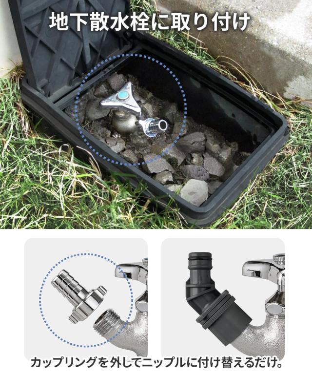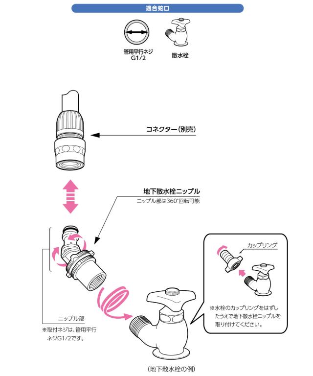 散水栓(地下に埋まった散水栓BOXに設置された蛇口)に散水用ホースをワンタッチ接続するためのニップル。
