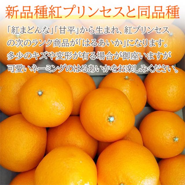 新品種で「紅まどんな」「甘平」から生まれ、紅プリンセスの次のランク商品が「はるあいか」になります。多少のキズや変形が有る場合が御座いますが、可愛いネーミングのはるあいかをお楽しみください。