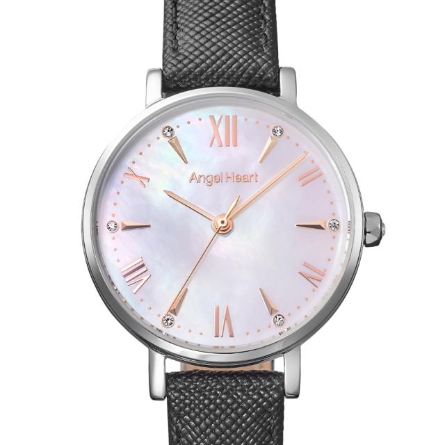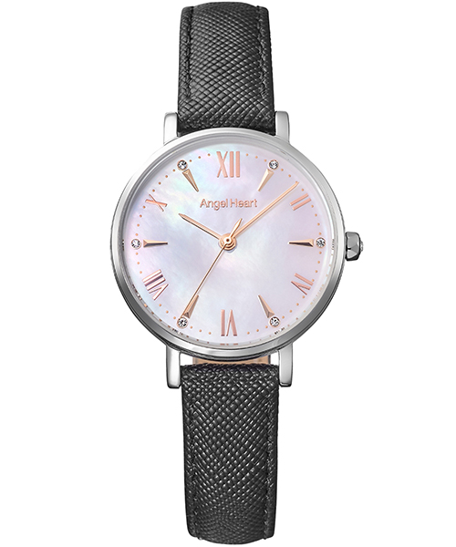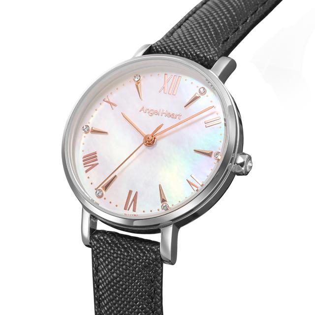ケースには上品なシルバーカラーを採用し、インデックスには柔らかなピンクゴールドカラーを組み合わせることで、華やかさと落ち着きを兼ね備えたエレガントなデザインに仕上げました。ダイヤルには美しい輝きを放つ白蝶貝(MOP)を採用し、見る角度によって変化する上品な表情が手元を華やかに彩ります。