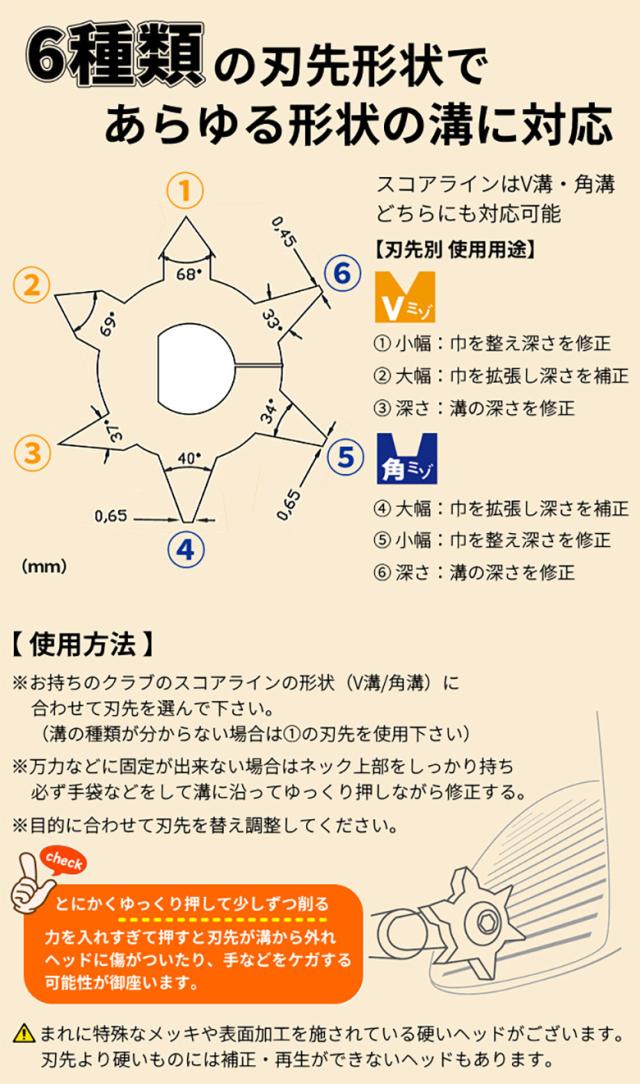 | 用途 | ゴルフヘッド スコアラインの汚れ落とし、ライン補正 |