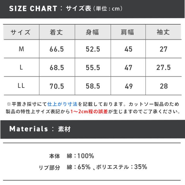 ※カットソー製品のため製品の特性上、サイズ表記より1〜2cm前後する可能性があります。