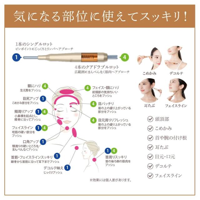 4本で痛みが敏感な部分でも均一にリズミカルにアプローチすることに適しています。