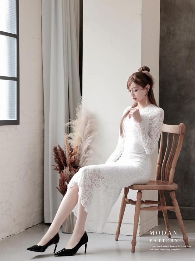 ☆長袖のデザインは二の腕をカバーしつつ、総レースの透け感で重たくなりすぎない印象を与えます。