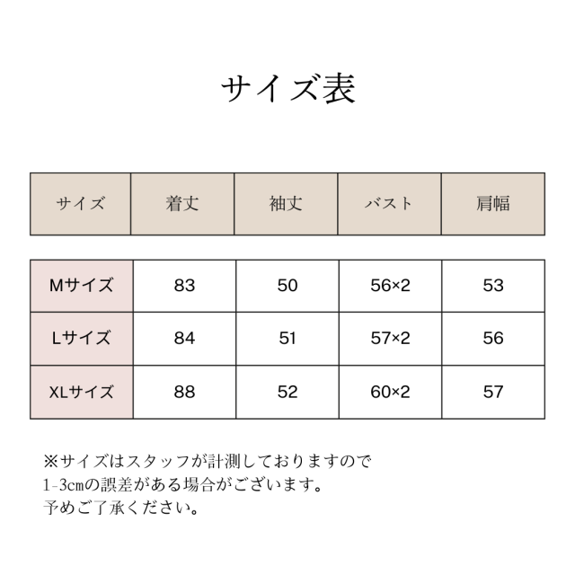 すべて平置きサイズです(採寸方法違いより、多少の誤差がございますので、ご了承ください)。