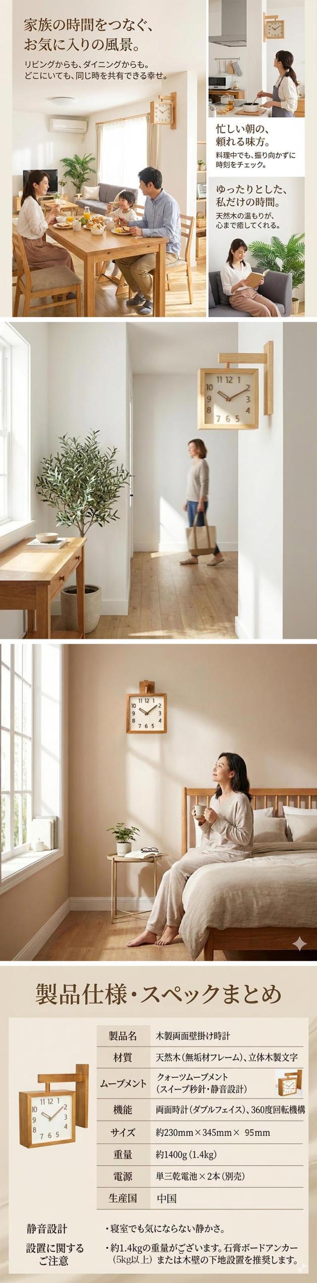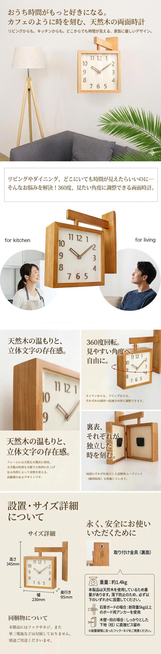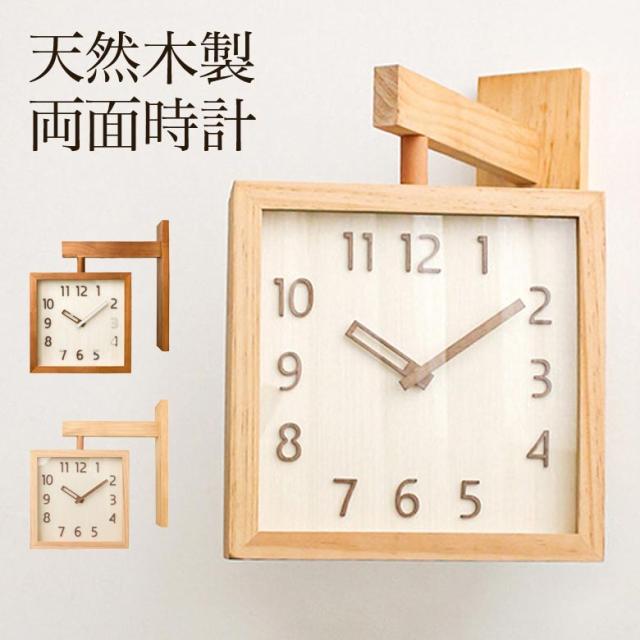 両面時計 壁掛け時計 掛け時計 ウォールクロック 木製 天然木 おしゃれ 北欧 カフェ風 360度回転 静音 スイープ秒針 アナログ 見やすい リビング インテリア 高級感 無垢材 音がしない 新築祝 引越祝 ギフト プレゼント 贈り物 誕生 人気