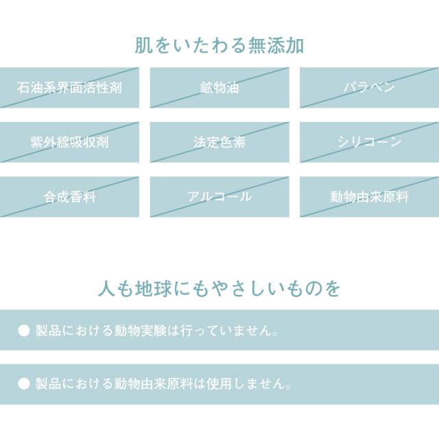 A: 石油系界面活性剤、鉱物油、パラベン、紫外線吸収剤、法定色素、シリコーン、合成香料、アルコール不使用です。ご心配な方はパッチテスト※を行ってからご使用ください。※二の腕の内側など柔らかい肌に塗布し、1日ないし2日間放置し、かゆみ・赤みなどの異常がないか確認してください。