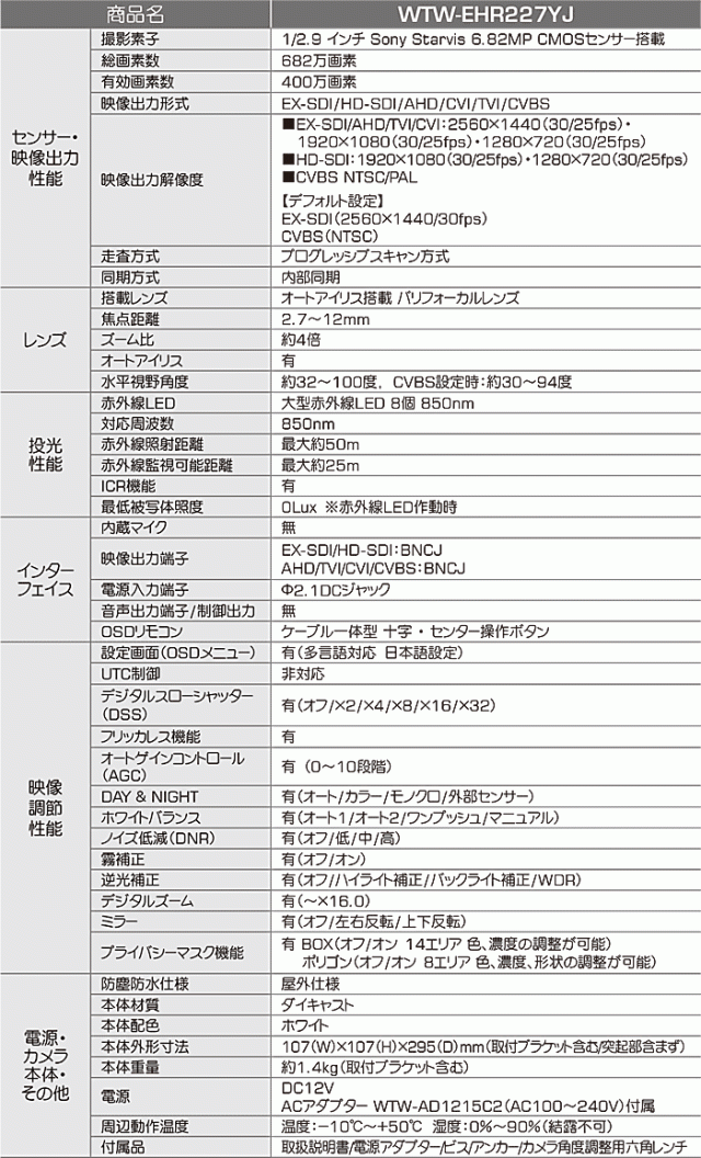 ■ WTW-EHR227YJ | 400万画素赤外線搭載マルチフォーマット対応バレット型カメラ