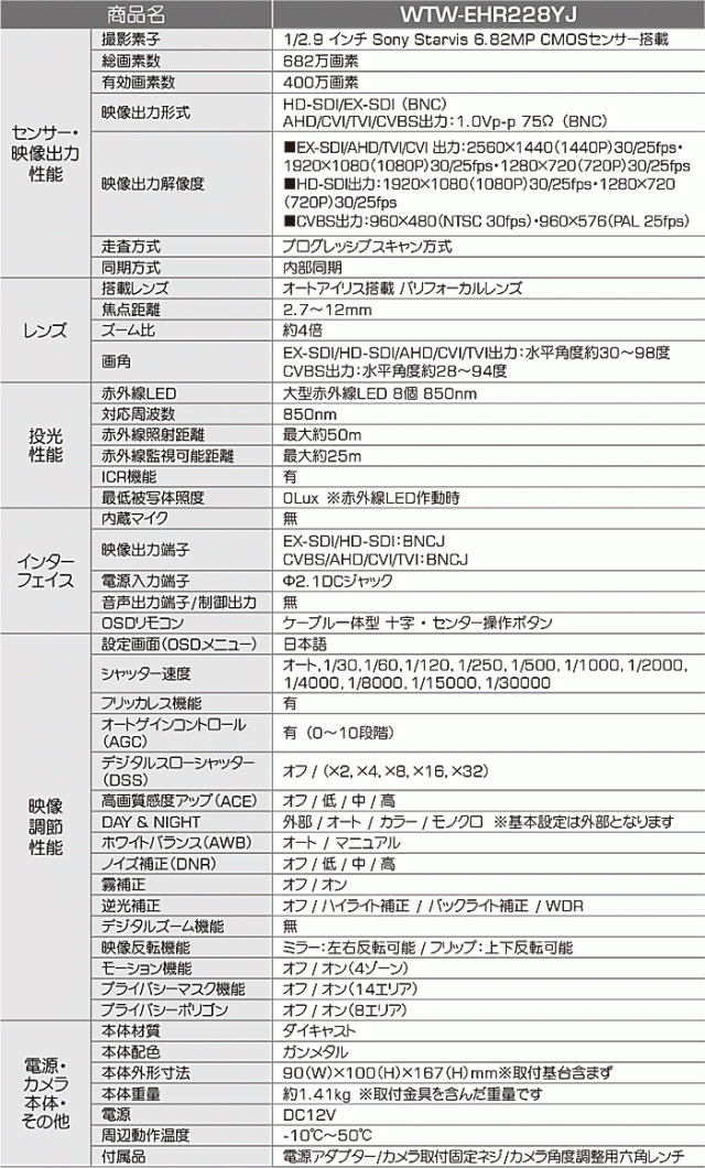 ■ WTW-EHR228YJ | 400万画素赤外線搭載マルチフォーマット対応バレット型カメラ