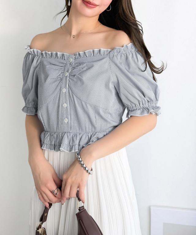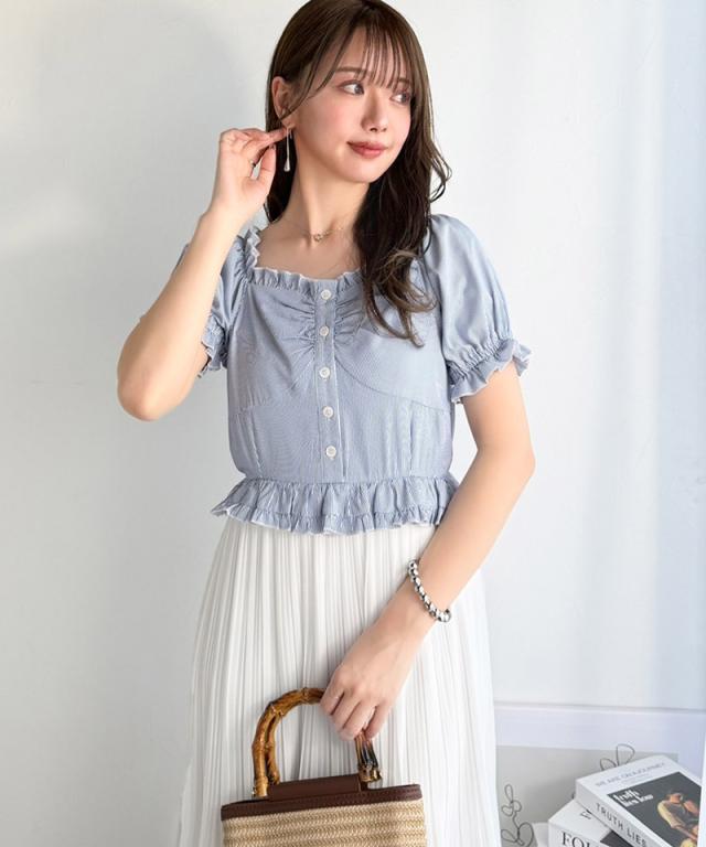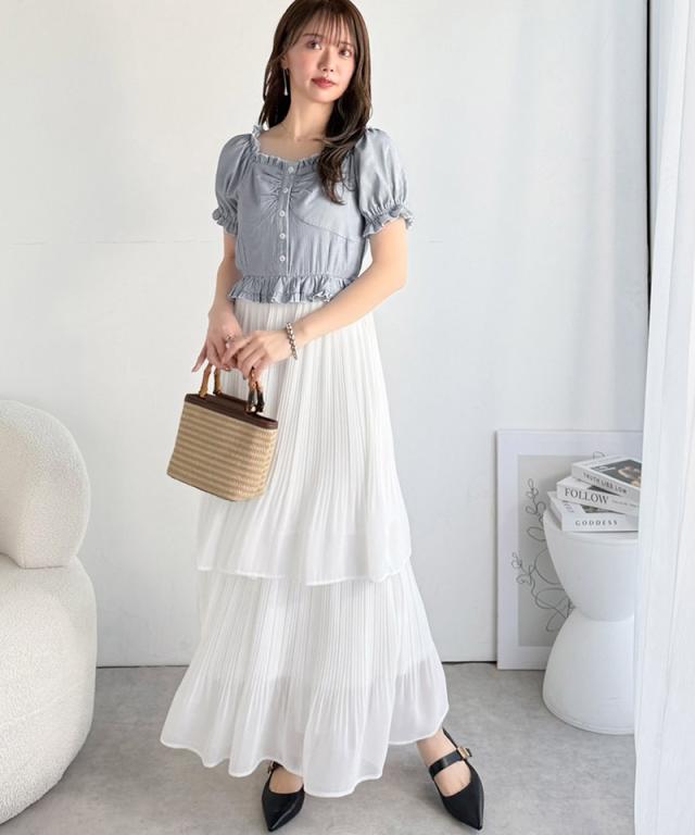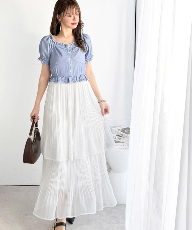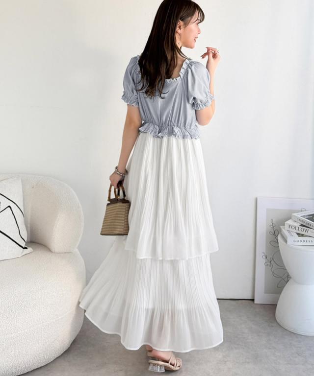 クラシカルエルフ夏新作 mily bilet ワンピース レディース レイヤード風 2Way パフスリーブ ブラウス プリーツスカート ドッキングワンピース ロング丈 ストライプ柄 シアー感 大人ガーリー ペプラムデザイン スクエアネック 大きいサイズ 2026ss mi1139109