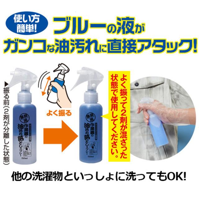 ガンコな油汚れに直接アタック!ガソリンスタンド御用達!作業着の油汚れ落としスプレー。