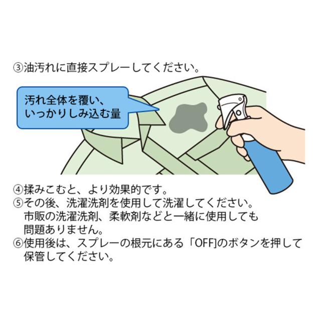 洗濯機に入れる前に油で汚れた衣類にスプレーしてしみ込ませるだけ!他の洗濯物と一緒に洗ってもOKです。