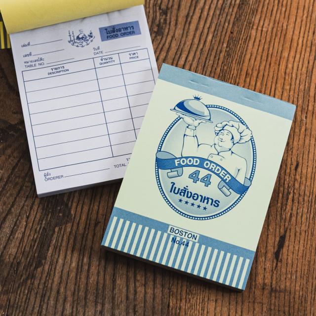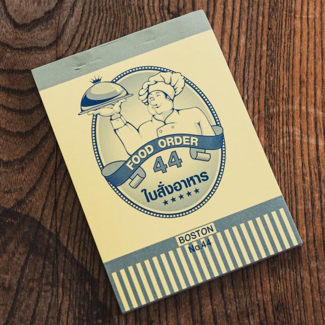 タイの雑貨屋さんで見つけてきた、飲食店で使われる注文伝票です。めくるとタイ語のコロコロした文字が見えてとってもかわいいです。ミシン目が入っているのでビリっと簡単に破ることができます。再生紙とつるつるした紙が交互に用いられているのもなんだか愛らしいですね。■メモ帳にも