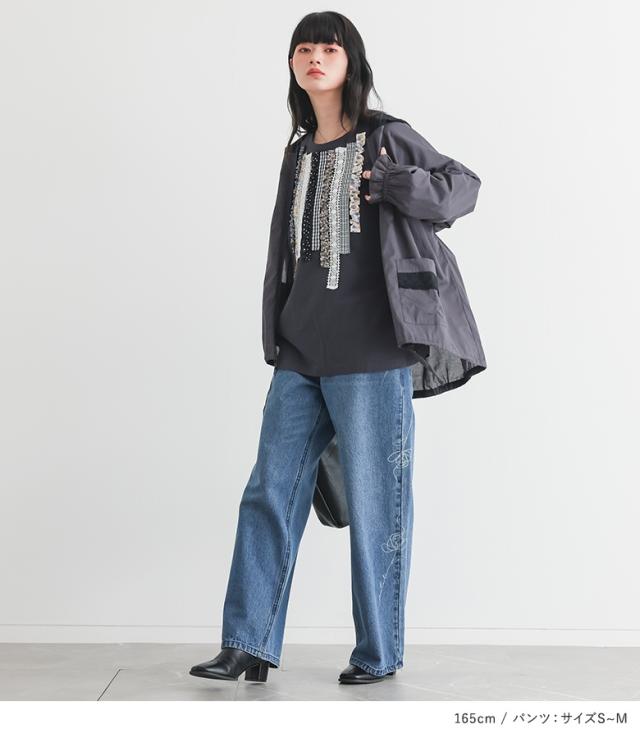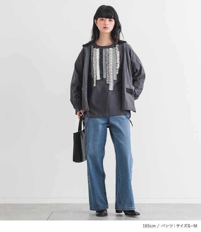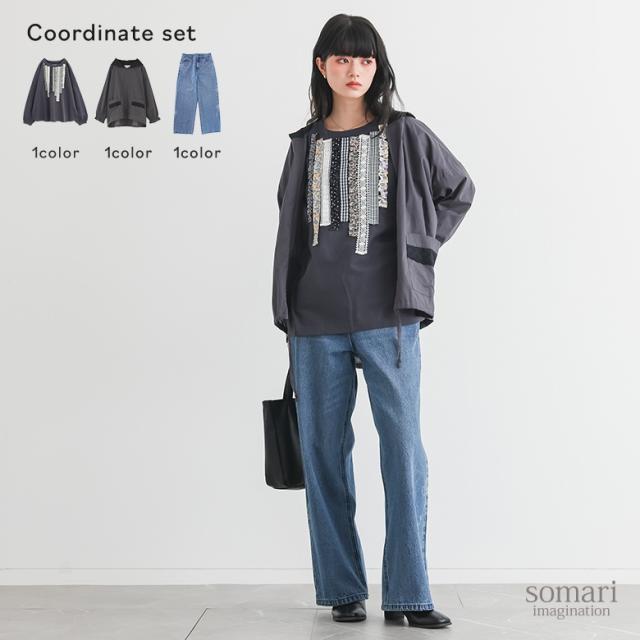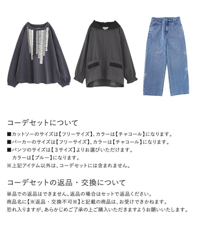 『プリントテープデザインカットソー×コットンレースフードパーカー×花柄モチーフストレートデニムパンツコーデ3点SET』【メール便不可】【50】[3点コーデセット 2026 レディース カットソー 長袖 パーカー デニム]