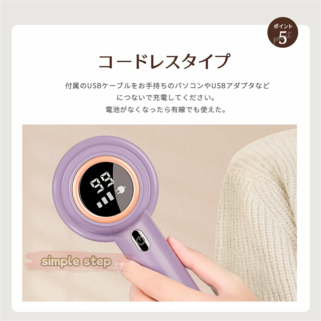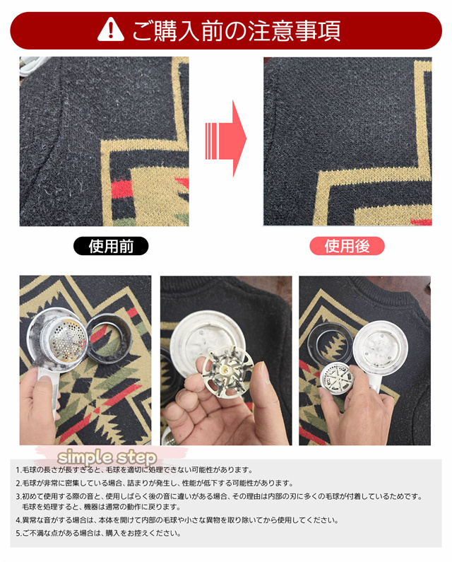- 毛玉取り機が壊れたので、こちらの製品を購入しました。充電式で使いやすく以前使っていたものより、とてもキレイに毛玉が取れたので大変満足しました。お掃除も簡単で壊れにくい作りに感じました。これで毛玉を気にせずに済みます。