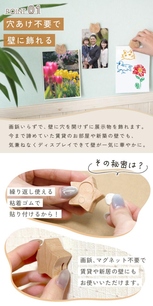 壁にピンや穴を残さず、跡が目立たない設計で、お部屋の雰囲気を壊さずに写真やイラストを飾れます。