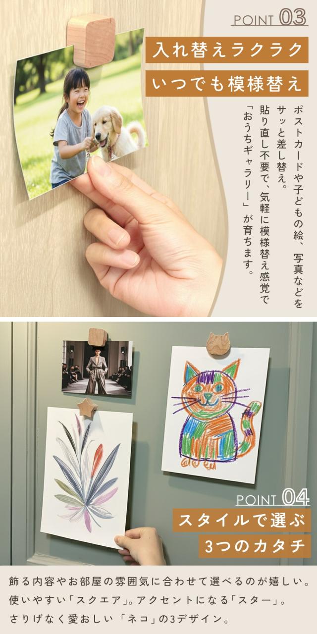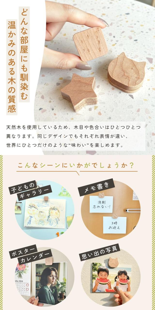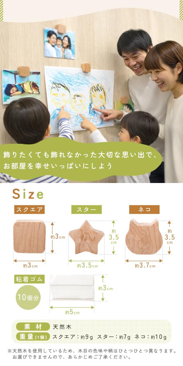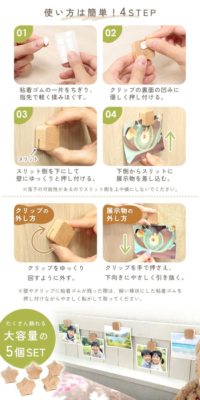 ノーホールクリップ/スクエア/スター/ネコ/ピクチャークリップ/セット/5個/木製/天然木/壁/穴をあけない/穴をあけずに飾れる/跡/残らない/木/おしゃれ/シンプル/ウォールクリップ/頑丈/強力/壁/ピン/穴/目立たない/壁掛け/イラスト/おえかき/ポストカード/絵/写真/飾る/写真立て/おうちギャラリー/インテリア/かわいい/メモ/ポスター/カレンダー/クリップ