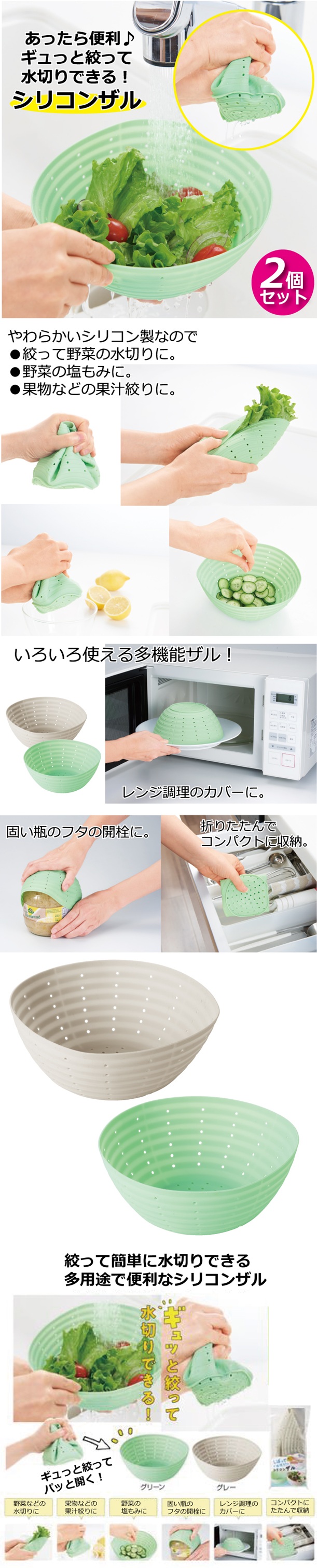 ザル ざる 2個セット シリコンザル 水切り 絞れる 湯切り 果汁絞り シリコン 調理器具 キッチン用品 電子レンジ 開栓 多機能 たためる 柔らかい グレー グリーン 2色セット
