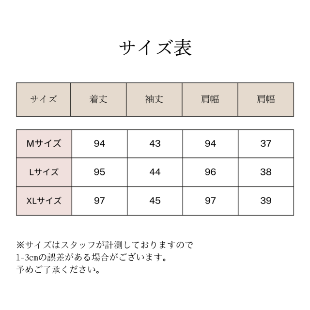 すべて平置きサイズです(採寸方法違いより、多少の誤差がございますので、ご了承ください)。