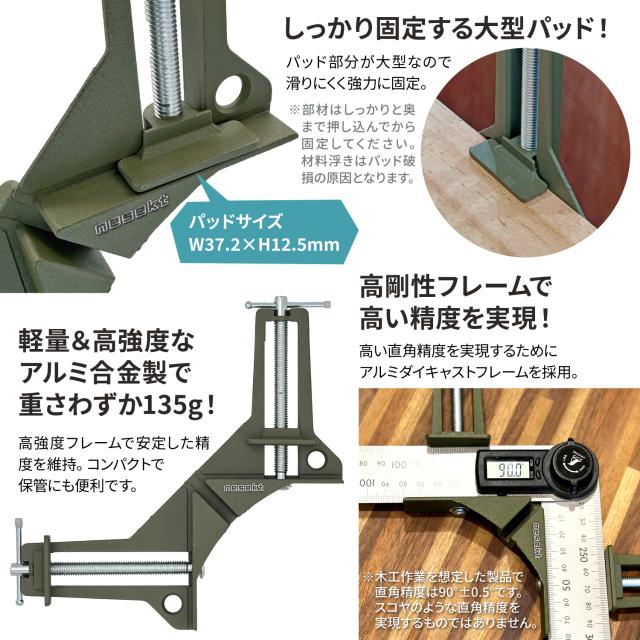 コーナークランプを使用することで木工作などにおいて材料同士を90度に固定することができます。直角の精度も高く、デジタルスケールの計測でも誤差は1度未満!高精度な仕上がりを求める方には必須の商品です。
